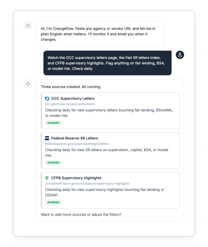 Changeflow watches those pages. You point it at an agency URL, describe what matters in plain English, and it reads the page. Alerts link straight to the primary source with no content licensing in the way. Pricing is public on the Changeflow pricing page. For federal financial regulators specifically, free alerts on our GovPing financial compliance hub cover the core feed at no cost to the reader.