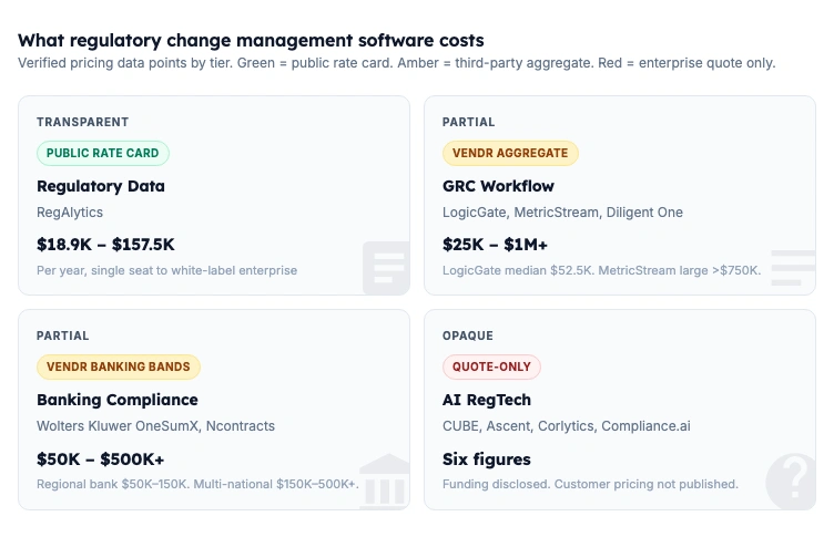 We spent a working day pulling every public number for the regulatory change management category we could verify. The result is less a rate card and more a map of what different buyers actually pay, where that data came from, and which vendors keep the numbers genuinely hidden.
