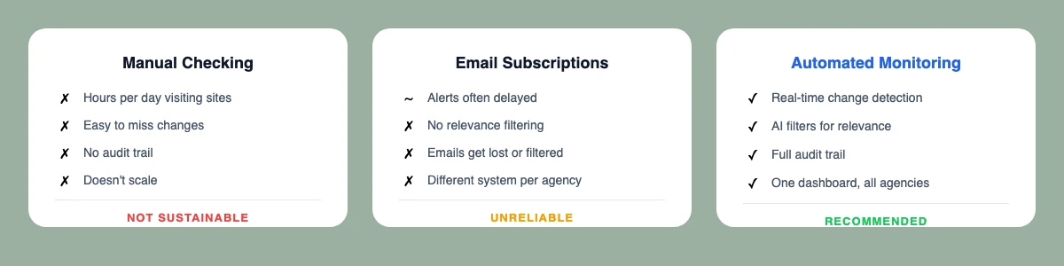 Some teams check regulatory websites manually. Every day, someone visits FDA.gov, SEC.gov, and a dozen other sites looking for updates.