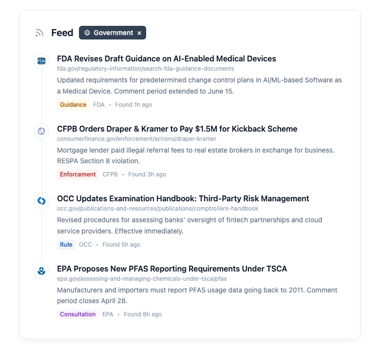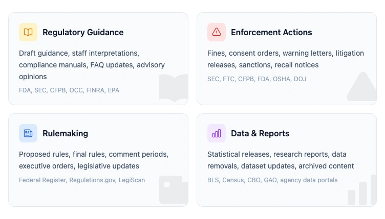 Enterprise regulatory intelligence platforms like FiscalNote and Wolters Kluwer track legislation and formal rulemaking. Good for knowing what Congress and state legislatures are doing. But an FDA draft guidance posted on fda.gov? A CFPB blog post signaling enforcement priorities? An OCC FAQ that changes how examiners interpret an existing rule? Those live on agency websites, not in legislation databases.