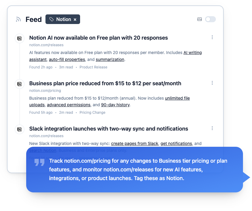 Solution: Monitor competitor product pages, feature announcements, and release notes with AI filtering for significant launches and updates.