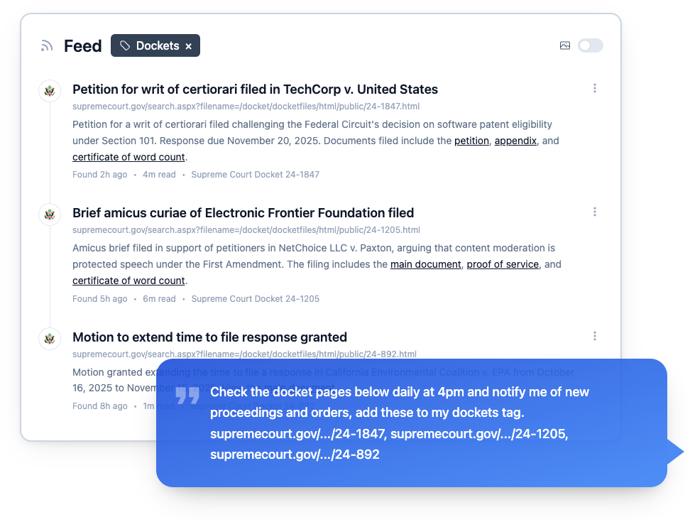 We monitor court websites including the Supreme Court, federal circuit courts, and state courts. Our AI understands court document structures and can alert you to new filings, opinions, orders, and docket updates—filtered to your specific cases or legal topics.
